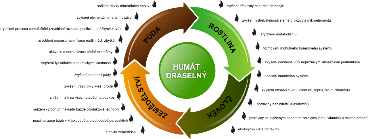 La conservación y el uso racional de la fertilidad del suelo constituyen la base de la estabilidad del desarrollo del sector agrícola y el crecimiento de la producción agrícola. El uso intensivo de los suelos a mediados del siglo XX, provocó una presión antropogénica sin precedentes sobre los recursos de la tierra, dando lugar a una enorme degradación de las tierras cultivables. Haciendo caso omiso a las leyes biológicas de la agricultura, la alteración en el equilibrio de la materia orgánica del suelo, el uso irracional de los productos químicos, la mencionada enorme presión antropogénica, y por último, pero no menos importante, la falta de apoyo y renovación de las tierras arables causó una reducción continua de la fertilidad del suelo. La condición fundamental para la restauración de los suelos y su fertilidad es el uso adecuado de los fertilizantes. Los humatos son unos fertilizantes orgánicos altamente eficaces que contienen micronutrientes con capacidad para estimular el crecimiento y aliviar la presión. Los humatos son la fuente de humus (base del suelo), de su actividad y de la estabilidad de sus procesos. Poseen un amplio espectro de influencia sobre las plantas y sus capacidades se manifiestan en todo tipo de cultivos agrarios. Por ejemplo, la aplicación de humatos permite aumentar el rendimiento y la calidad de la producción agrícola. En concreto, aumenta el contenido de proteína en el maíz y el contenido de gluten y trigo en 1-2 unidades, el contenido de aceite de girasol en un 2-3 por ciento y el contenido de azúcar en las patatas (hasta un 20-25 por ciento) y en las sandías (hasta el 50 por ciento). Las sustancias húmicas se producen a través de humificación química y biológica de plantas y animales debido a la actividad biológica de los microorganismos.